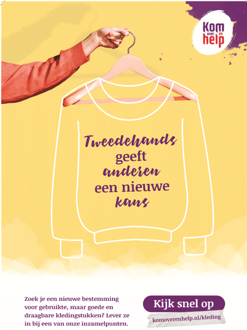 Bij ons kun je ook kleding en textiel inleveren voor de stichting Kom over en help. Je kunt ten alle tijden je kleding inleveren, want je kunt je zak/doos gewoon onder het afdak bij de voordeur neer zetten. Vet handig! 😊 Vervolgens zetten wij het weer klaar voor Kom over en Help. Wij, en ook hun zijn je zeer dankbaar voor het inleveren van de kleding.