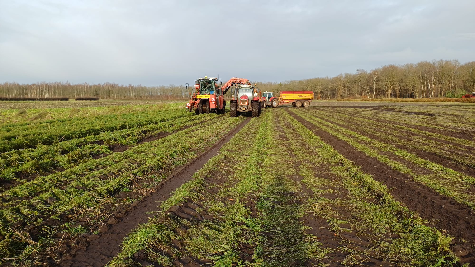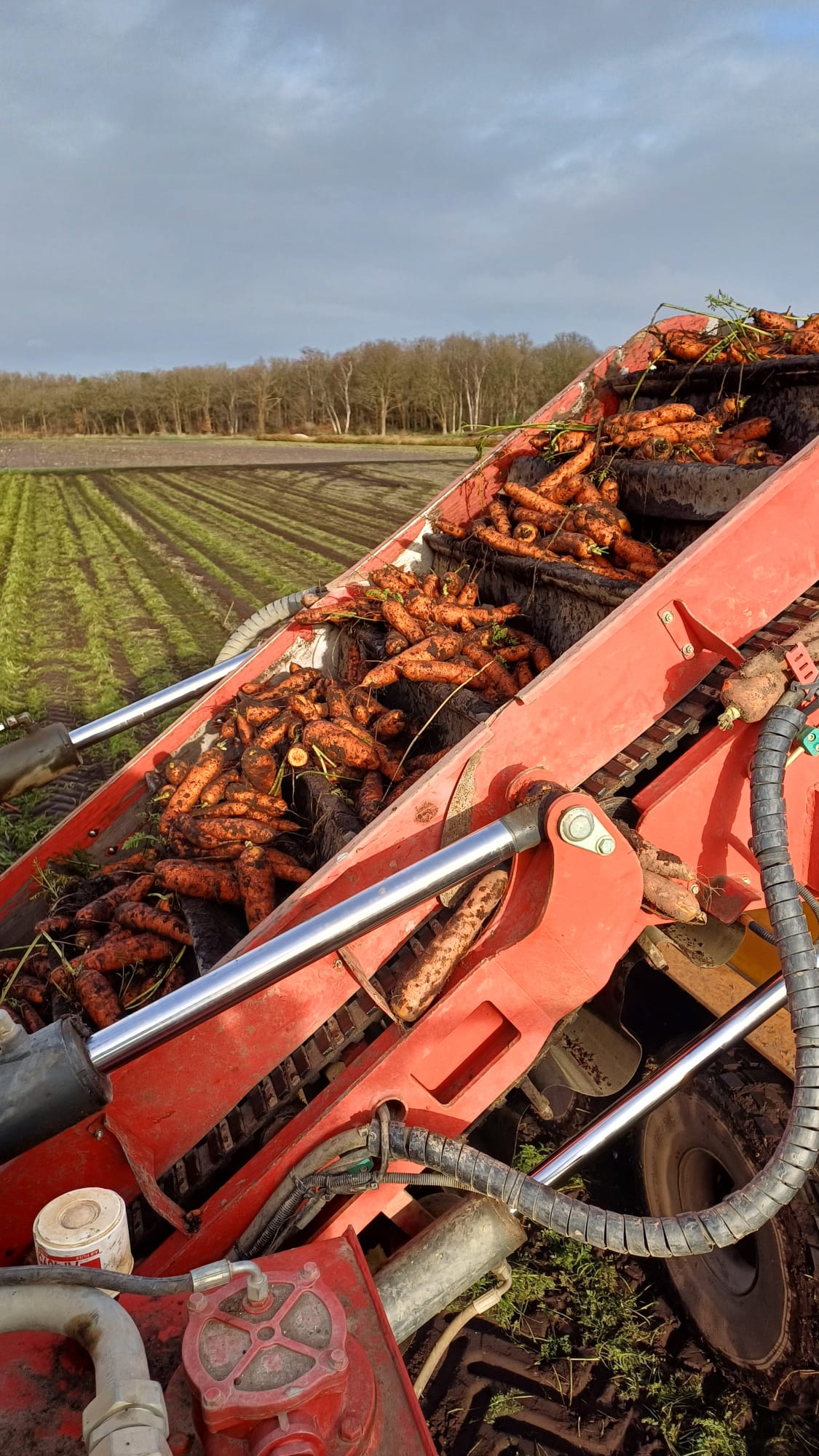 Sinds 2024 telen wij wortels op contractteelt. De teelt start in mei/ juni en begint met het woelen van het land. Het land moet goed los zijn zodat de wortel recht naar beneden kan groeien, om zo uiteindelijk een mooie, lange wortel te kunnen vormen. Als dit klaar is, wordt er geploegd en gevreesd zodat er vervolgens gezaaid kan worden. Er worden wel 2.000.000 zaadjes per hectare gezaaid. Het is een uitdagende teelt met onder andere de bedreiging van de wortelvlieg. De wortelvlieg kan veel schade toebrengen aan de wortelen. We telen de wortels voor de versmarkt, dat betekent voor ons dat wij in de oogsttijd regelmatig 1 á 2 vrachtwagen vol mogen leveren. Soms om de dag, soms 1 keer per week. De oogst wordt gedaan door de loonwerker: wij rijden mee met de kipper. Een collega teler laadt de vrachtwagens vol.